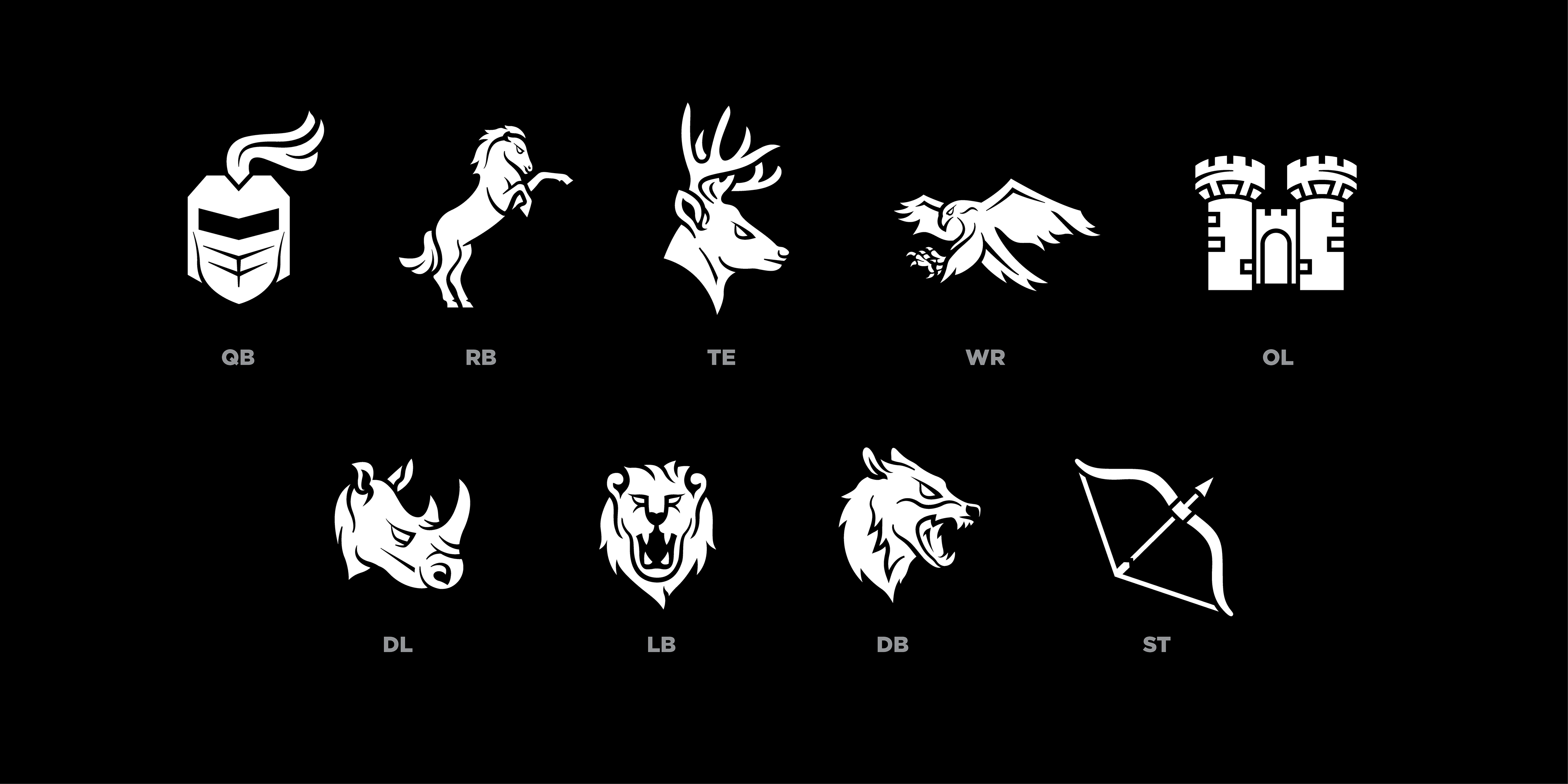 position icons | Quarterback (QB) – Commander of the Offense, Running Back (RB) – Work Horse, Tight End (TE) – Strength and Speed of a Buck, Wide Receiver (WR) – Precision Flying of an Eagle, Offensive Line (OL) – Protective Fortress, Defensive Line (DL) – Charging Rhinoceros, Linebacker (LB) – Lion Heart, Defensive Backs (DB) – Pack Hunting of Wolves, Special Teams (ST) – Technicians/Marksmen.